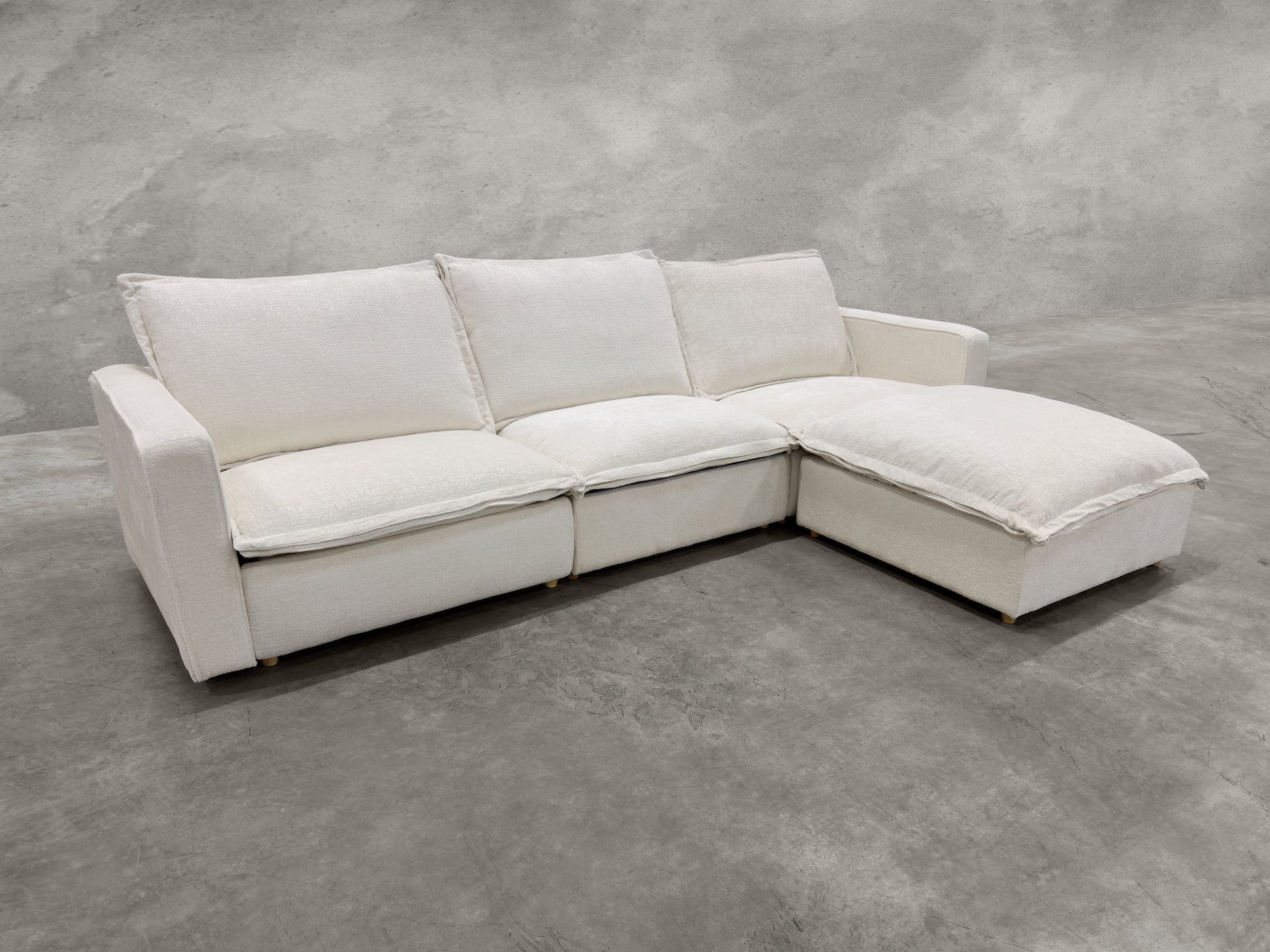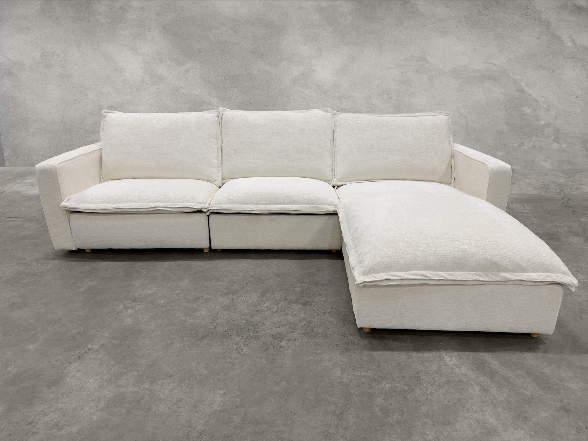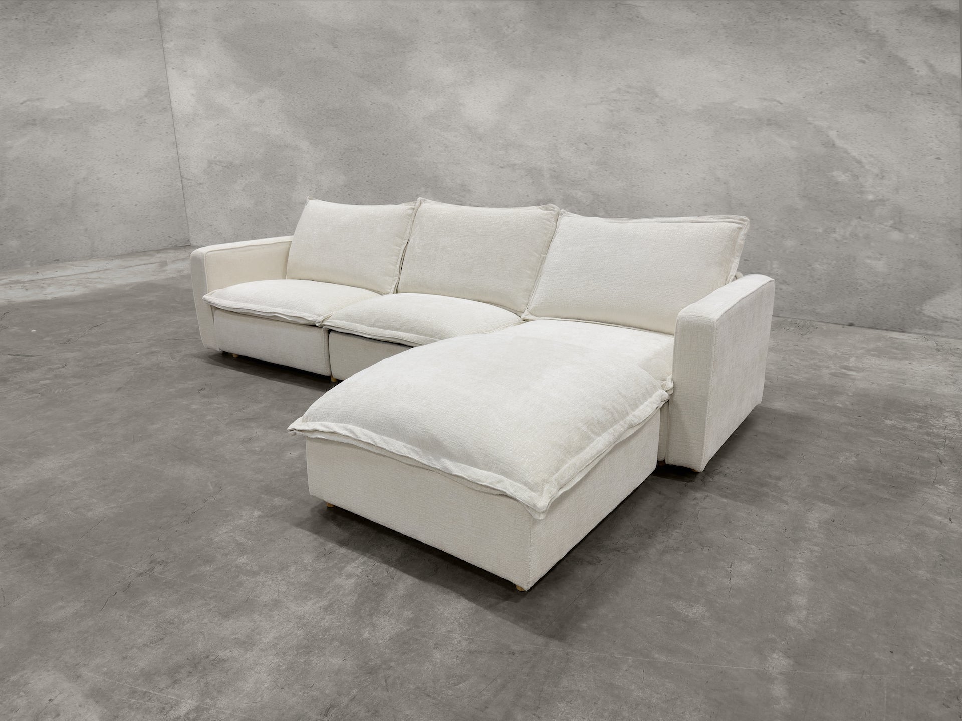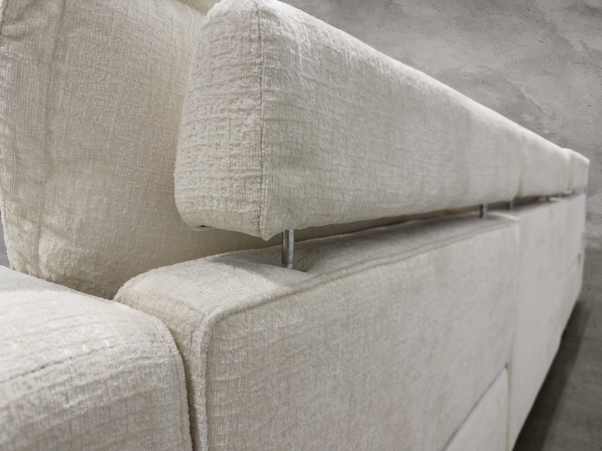 Experience ultimate comfort with the NIRVANA SECTIONAL. Our seat cushions are made of a unique blend of recycled, sterilized down and feathers, providing a dense, foam-padded support that will truly elevate your relaxation experience.