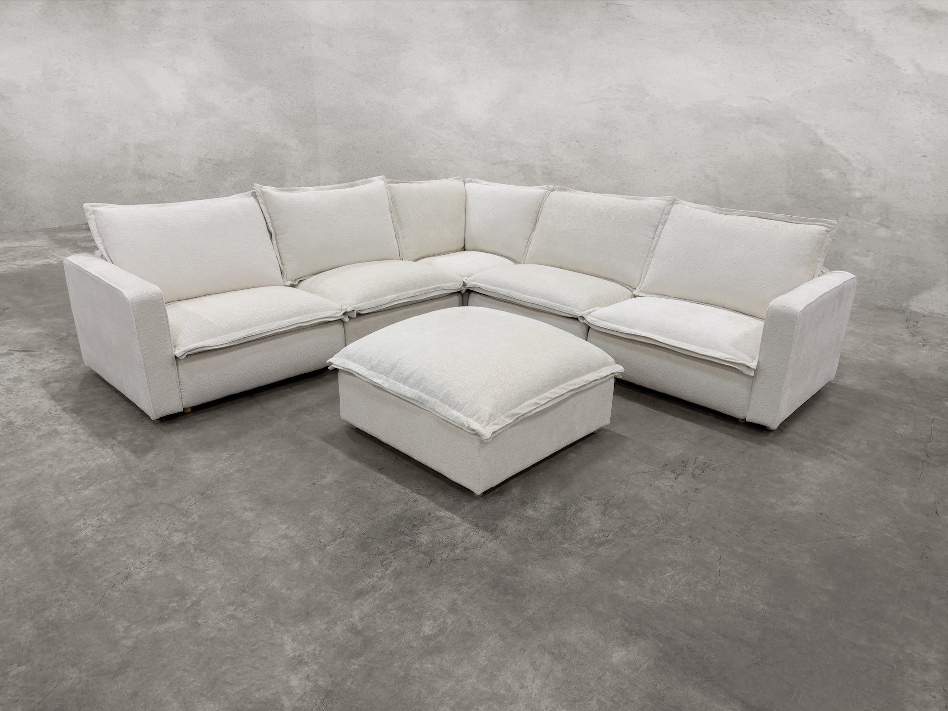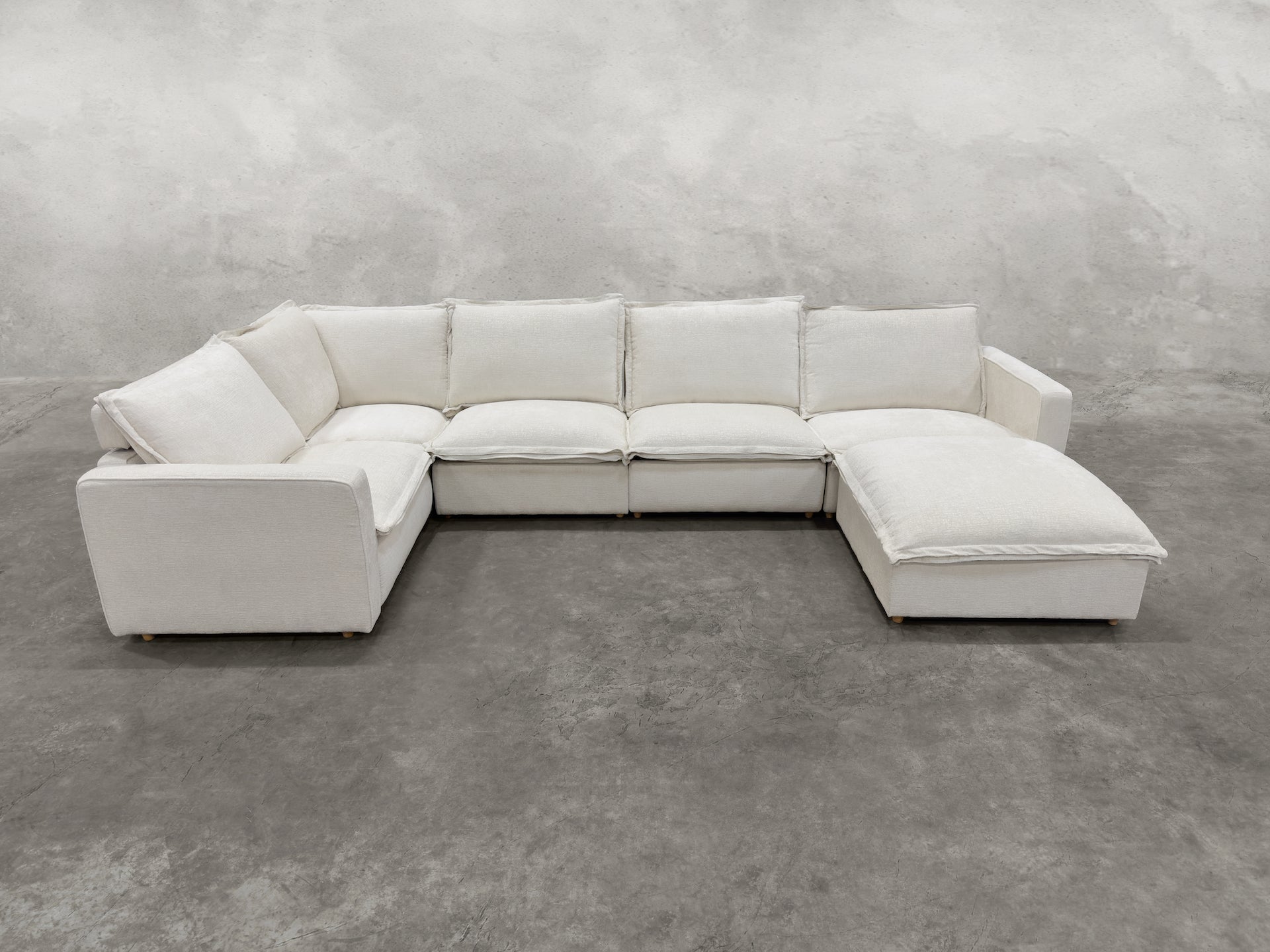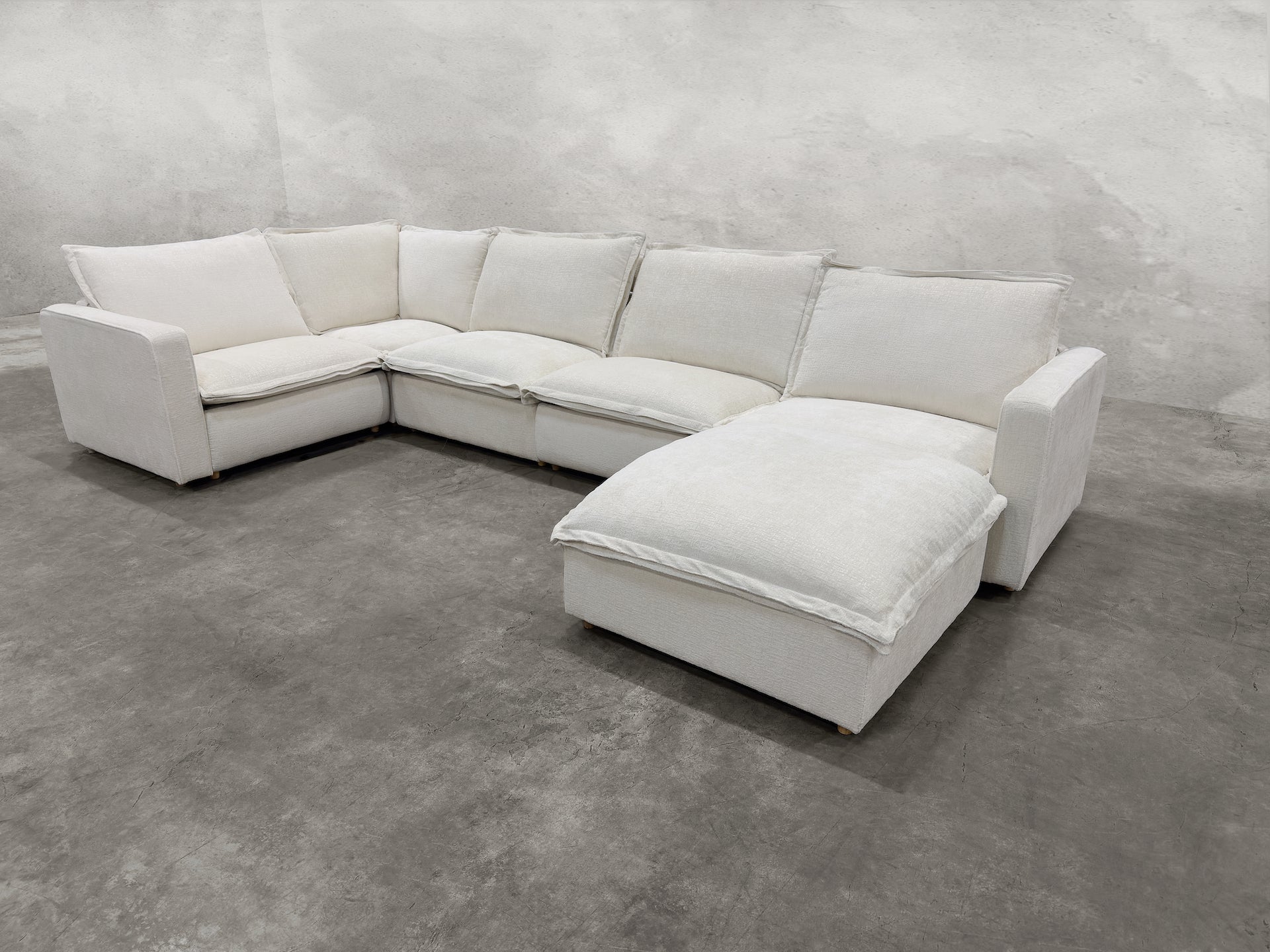 Experience ultimate comfort with the NIRVANA SECTIONAL. Our seat cushions are made of a unique blend of recycled, sterilized down and feathers, providing a dense, foam-padded support that will truly elevate your relaxation experience.